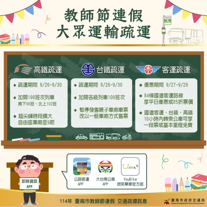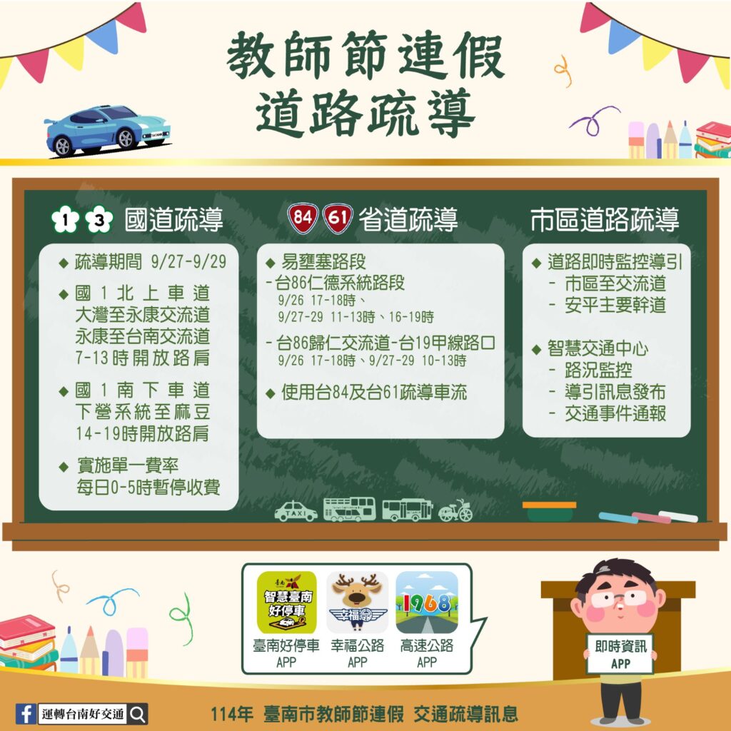教師節連假(9/27~9/29)自本週六開始,台南市長黃偉哲籲請市民朋友返鄉出遊前可先做好行程規劃,並責成交通局等相關單位持續監控易壅塞路段、即時發布改道訊息及調整塞車道路號誌,請用路人配合警方疏導,避開可能擁擠路段,節省旅行時間。