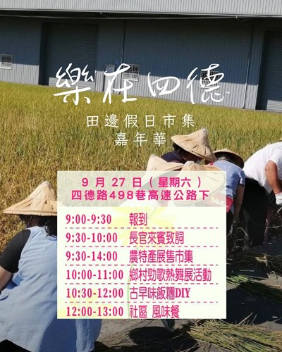 農業部農村發展及水土保持署及台中市政府農業局,攜手霧峰區四德社區發展協會,共同於9月27日(星期六)上午9時30分,在霧峰區四德路國三高架下(四德路498巷高速公路下),精心準備了一場充滿人情味的盛會!「樂在四德 田邊假日市集嘉年華」,邀請民眾在稻浪旁聽音樂、逛市集、玩食農。