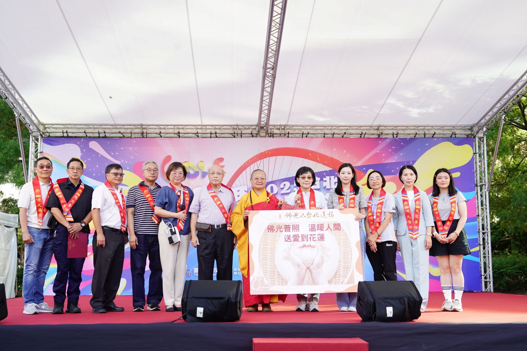 颱風樺加沙造成花蓮嚴重災情,在27日「2025台北水舞嘉年華」主題活動「佛光山三好藝蔬節」中,佛光山台北道場與臺北市觀光傳播局特別舉辦祈福及捐贈儀式,為花蓮受災民眾祈求平安,期盼災區能早日回歸正常生活、重建家園。