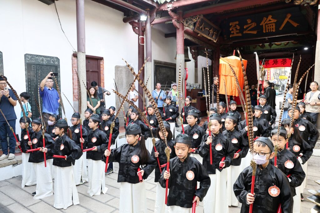 祭奠禮樂生由台南文廟以成書院院生擔任,六佾舞則由永福國小41位學童演出,佾生在學校老師及廟方引領下,行迎神禮表達對武聖的敬意。典禮結束後,市長黃偉哲特別頒發佾生證予學童並合影,讓參與的小朋友留下快樂回憶。