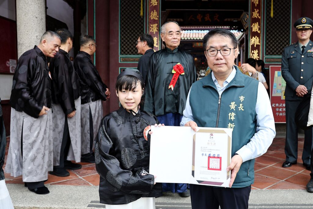 市長黃偉哲特別頒發佾生證予學童並合影,讓參與的小朋友留下快樂回憶。