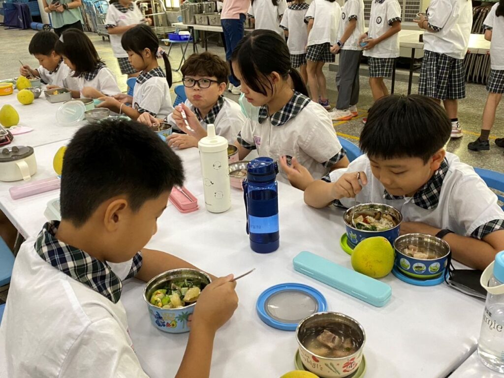 永康國小營養師王瓊嫣表示,學校營養午餐透過結合臺南在地食材與二十四節氣,量身打造多樣且營養的節氣美食,適逢秋季時節,學校午餐也特別推出秋季美食─「黃豆炊飯、柚香魚柳、滑蛋絲瓜、菱角排骨湯、桂圓紅棗茶、文旦」,完整呈現天然食材及美味,同時提升環境永續及均衡飲食的觀念,讓學童感受濃濃的秋意風情,共享季節的味道。
