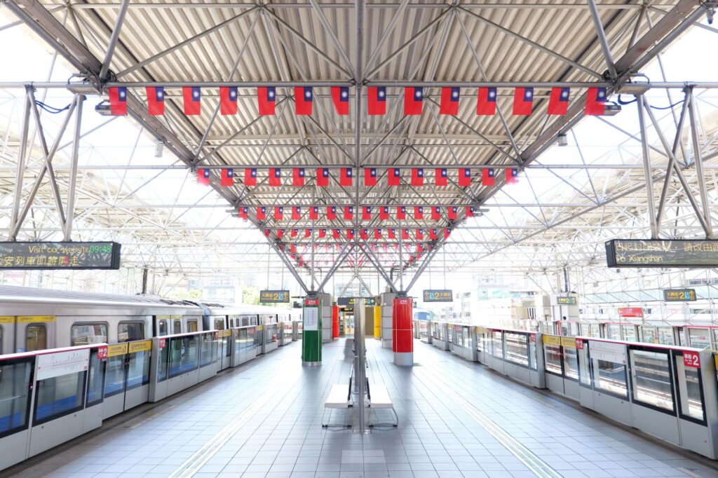 臺北捷運邀請大家搭乘國慶主題彩繪列車,走進國旗飄揚的車站空間,自信前行,共同為中華民國喝采!