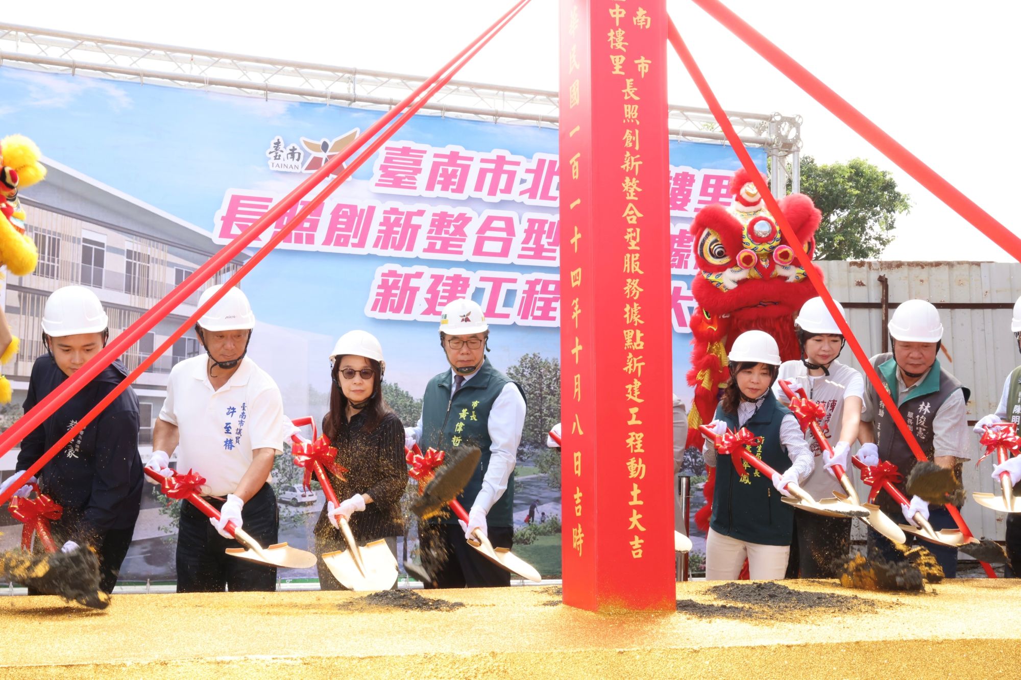 「台南市北區中樓里長照創新整合型服務據點」8日上午舉行開工動土典禮,台南市長黃偉哲與財政部國有財產署南區分署分署長黃莉莉、市議員陳怡珍、沈震東、許至椿、蔡宗豪,以及立委陳亭妃、林俊憲、謝龍介等服務處代表及各議員服務處代表共同出席,見證台南長照體系的重要里程碑。