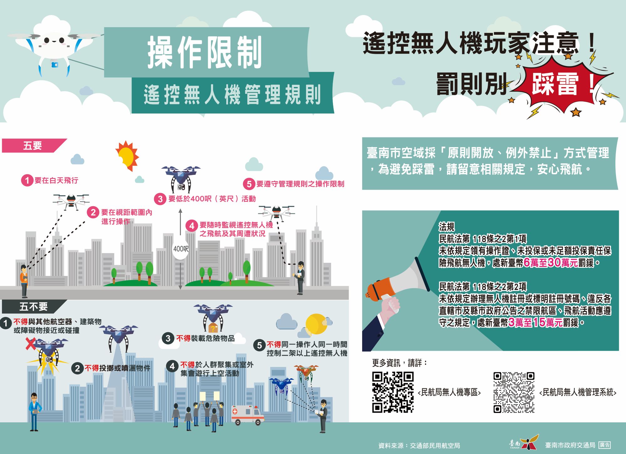 臺南市無人機空域採「原則開放,例外禁止」方式管理,臺南市交通局長王銘德呼籲請飛友飛行前確認空域限制,並遵守「5要5不要」操作限制原則。