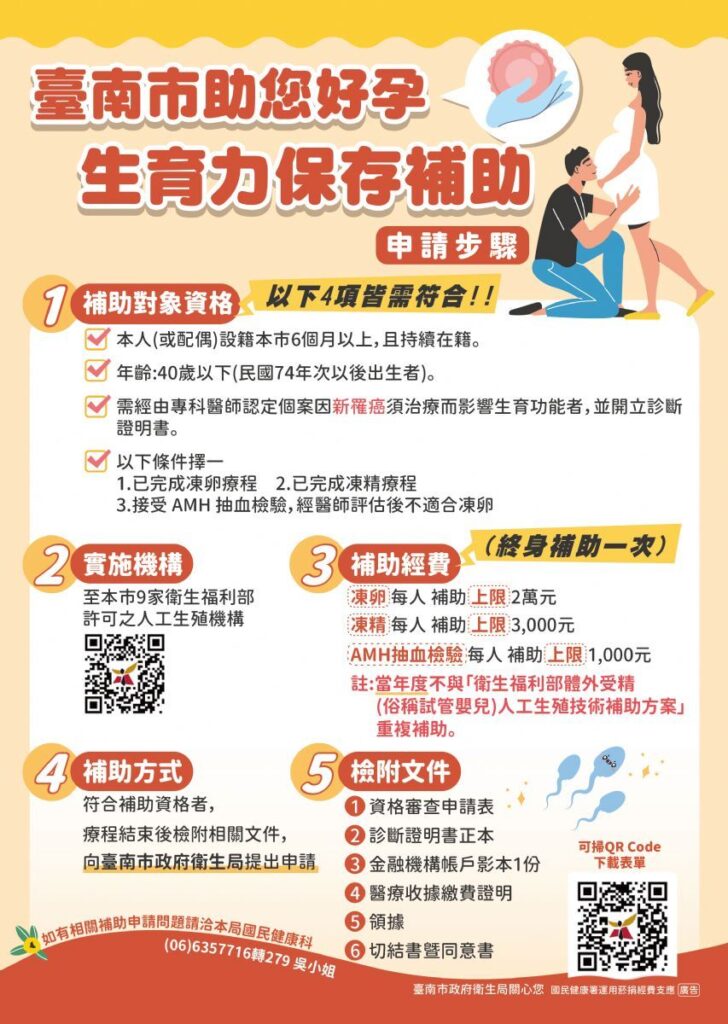 臺南市政府的加碼補助不限癌別,只要設籍南市滿6個月以上、未滿40歲,並經專科醫師評估治療將影響生育功能,且已接受凍卵或凍精療程者,即可申請補助。女性凍卵最高補助2萬元、男性凍精最高補助3,000元,終身補助一次。值得注意的是,市民可先申請中央補助,再申請南市補助,享有雙重支持。