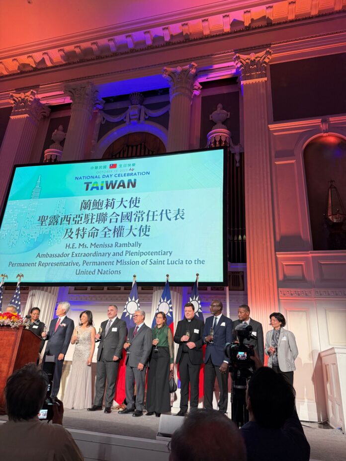 公園大道宴會堂舉行的國慶酒會,進場人士只憑邀請,參加者非常踴躍,冠蓋雲集,數百人同時享受美食佳餚醇酒,喧嘩激動,喜氣洋洋。晚會慶典在中美國歌開場之後,由紐約台北經濟文化辦事處處長李志強大使致詞,接連有僑領及友邦代表、紐約及新澤西的市參眾議員們,一一上台祝賀及頒獎,氣氛溫馨又熱情,人人可以感受到對中華民國的支持及國家生日的喜悦。