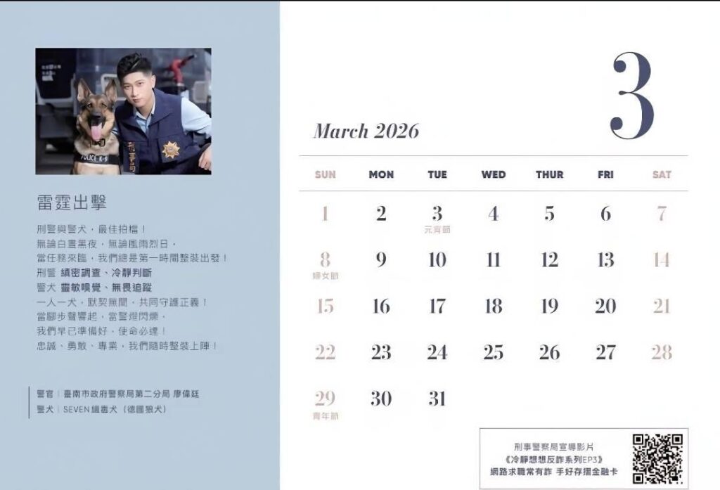 由內政部警政署刑事警察局攜手財團法人微風慈善基金會及中華民國國際刑警之友協會共同推出的《2026公益寫真月曆》,今年以「警警相依」為主題,再度以溫暖視角呈現刑警與警犬並肩守護社會的身影,傳達警察工作的專業與人性光輝。在本次月曆中,南警二分局偵查隊偵查佐廖偉廷榮登三月份代言人,以具代表性的警察形象與溫暖故事入鏡,成為本屆公益月曆中最具亮點的人物之一。