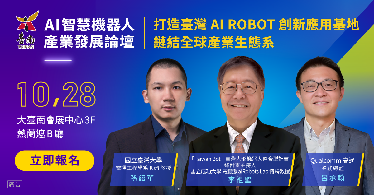 近年來,AI 與智慧機器人技術持續蓬勃發展,廣泛應用於製造、自駕、醫療、農業、服務業等領域,成為全球產業升級與城市轉型的關鍵驅動力。為因應產業與社會實際需求,促進跨領域技術整合與實務應用落地,臺南市政府經濟發展局將在 10/28舉辦「AI 智慧機器人產業發展論壇」,邀請產業專家學者、業界領袖共同參與,針對「AI 全球趨勢發展」、「智慧技術多領域應用」、「推動智慧產業升級」、「串聯臺南優勢產業鏈」等關鍵主題進行交流分享,共同激盪與強化臺南作為「智慧機器人產業聚落」的產業能量。