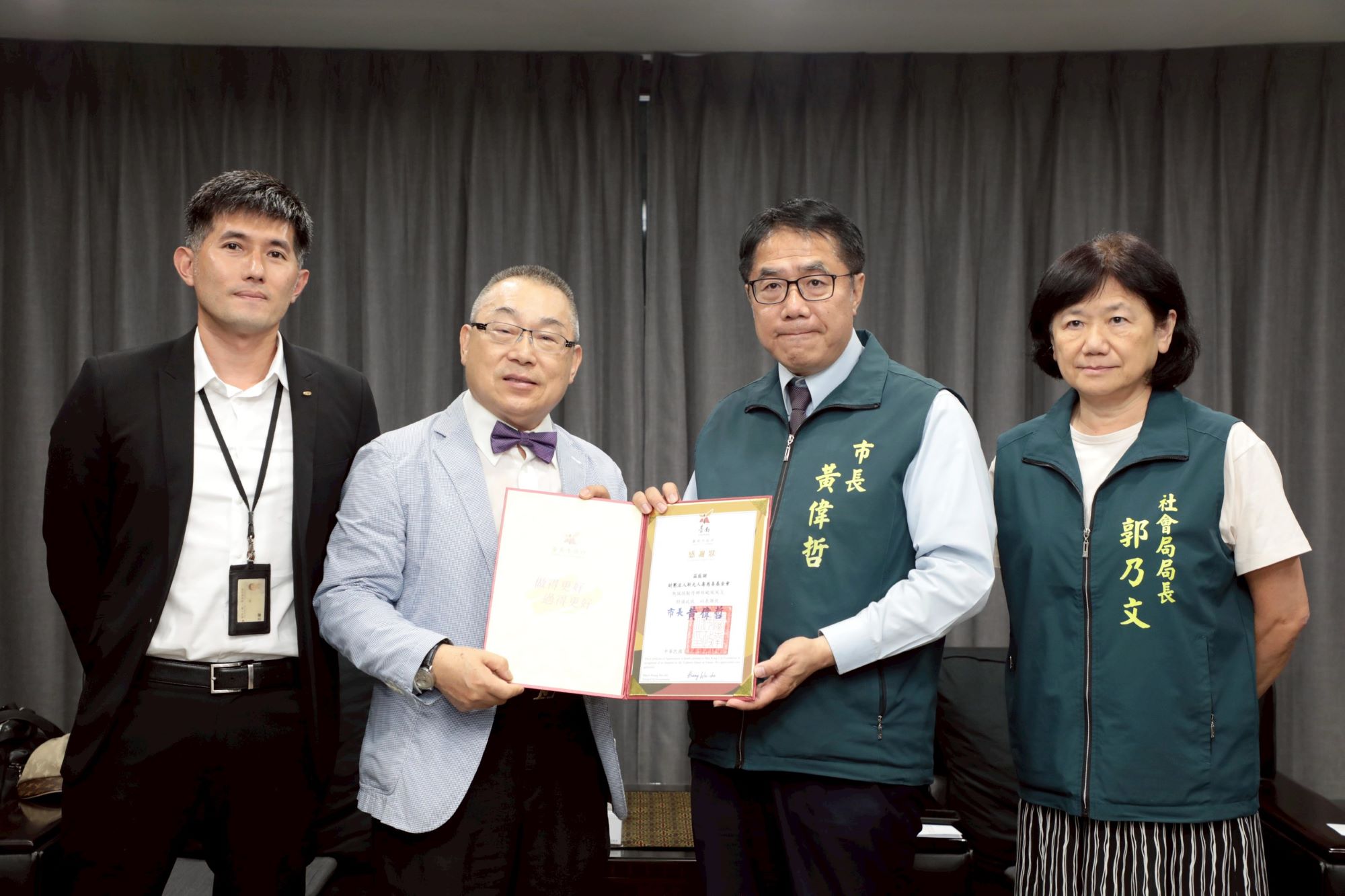 為支持台南市受丹娜絲風災影響地區的災後重建工作,新光人壽慈善基金會於今(14)日捐贈善款予台南市政府,由巿長黃偉哲代表市府受贈,並頒發感謝狀,感謝新光人壽慈善基金會的善行義舉。