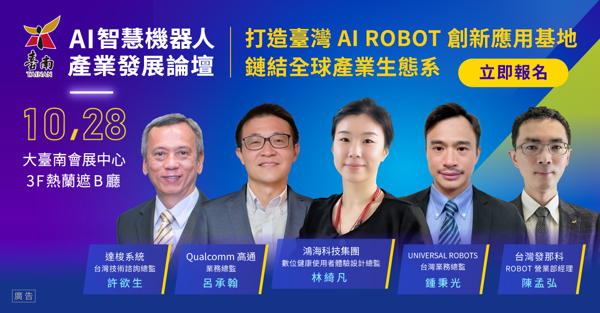 行政院宣佈臺南六甲工研院院區及柳營科學園區第三期,將成為智慧機器人發展與應用的重要基地,臺南市不僅全力配合中央政策推動,更協助產業鏈整合與到位應用。為協助各界掌握 AI 與智慧機器人產業發展的重要契機,臺南市政府經濟發展局將在 10/28(二)於大臺南會展中心舉辦「AI 智慧機器人產業發展論壇」,特別邀請鴻海科技集團、Qualcomm 高通、UNIVERSAL ROBOTS、達梭系統、台灣發那科等重磅講者,剖析機器人趨勢與實戰應用。
