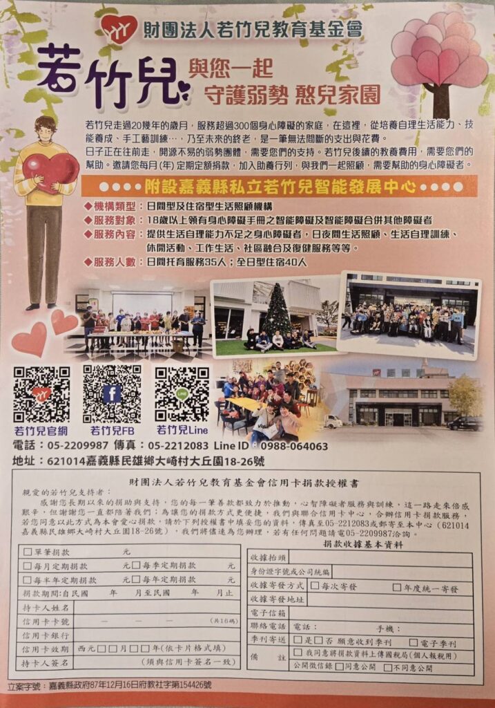 嘉義縣【若竹兒教育基金會附設智能發展中心】致力照顧與教育18歲以上智能障礙及多重障礙者,陪伴他們學習生活自理、重拾自信、安心成長。「若竹兒」取自「弱智兒」諧音,象徵竹子般堅韌與希望,願每位孩子都能在愛中挺拔茁壯。誠摯邀您捐款支持營運基金,讓愛延續,讓希望萌芽。